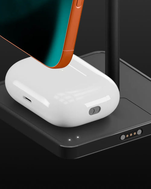- Eine zweite Qi-Spule an der Basis ermöglicht die gleichzeitige Stromversorgung eines zweiten Geräts, z. B. eines Kopfhörers.