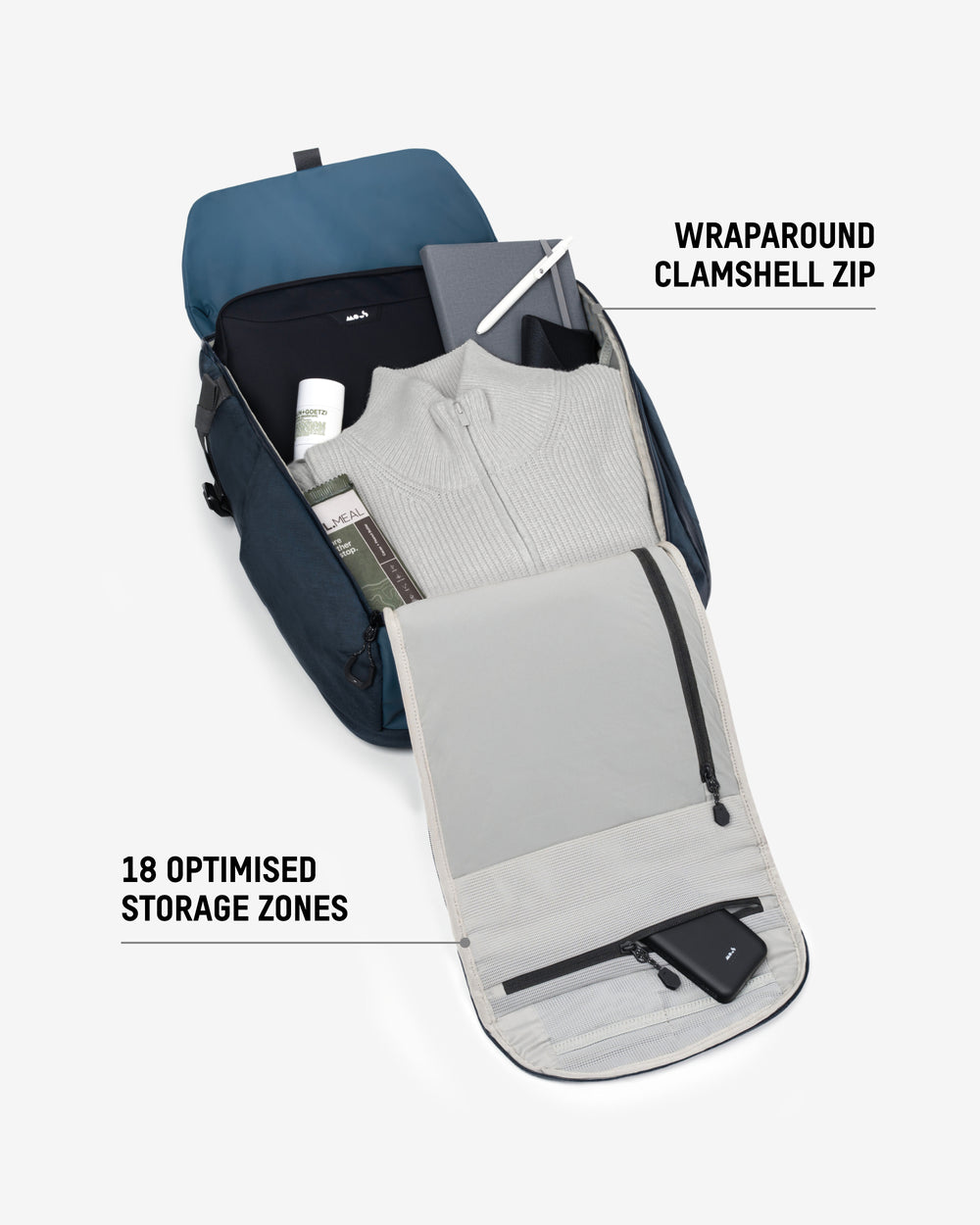 • 18 purpose-built pockets, including stretch mesh, quick-access, hidden AirTag and water bottle holder.