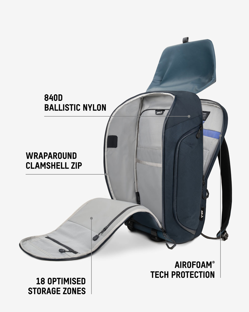 • Protective tech compartment with AiroFoam® absorbs shock from drops.
