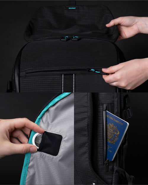 - 18 speziell angefertigte Taschen, einschließlich Stretch-Mesh, Schnellzugriff, versteckter AirTag und Wasserflaschenhalter.