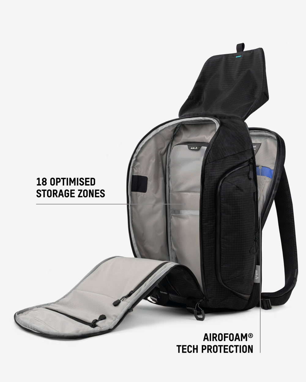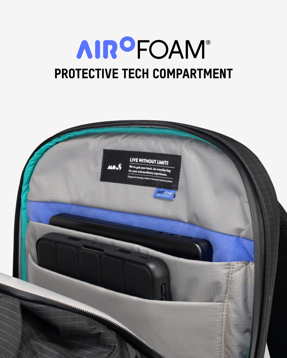 • Protective tech compartment with AiroFoam® absorbs shock from drops.