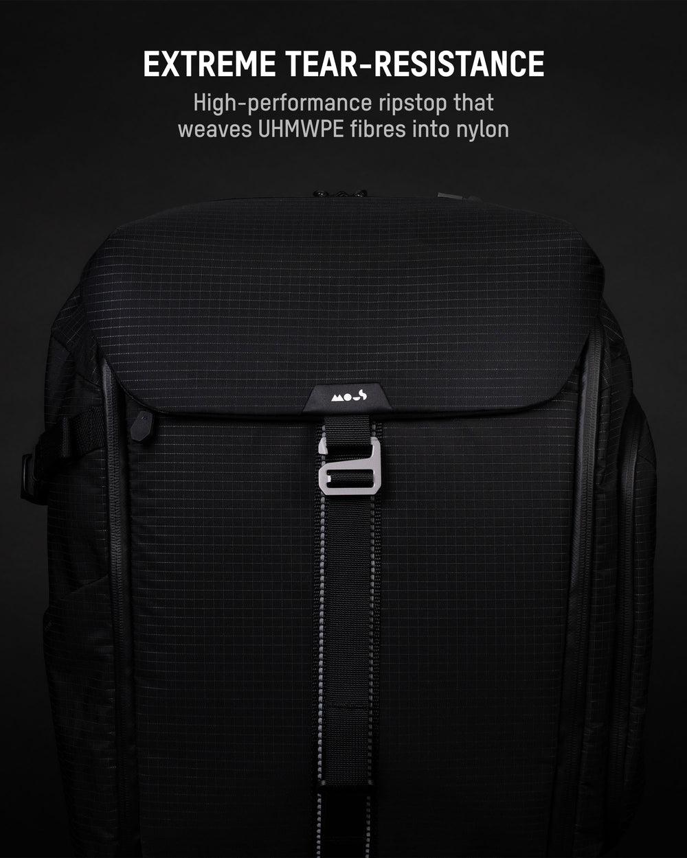 • Woven into this is a grid of UHMWPE fibres – ultra-high-molecular-weight polyethylene that’s 15× stronger than steel by weight – forming a ripstop to stop tears from spreading.