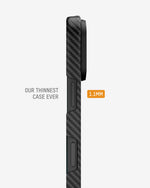 Our thinnest case, moulded from aramid fibre for everyday durability with a seriously slim profile, strategic cut‑outs for unhindered button access and full MagSafe®/Qi2 compatibility.