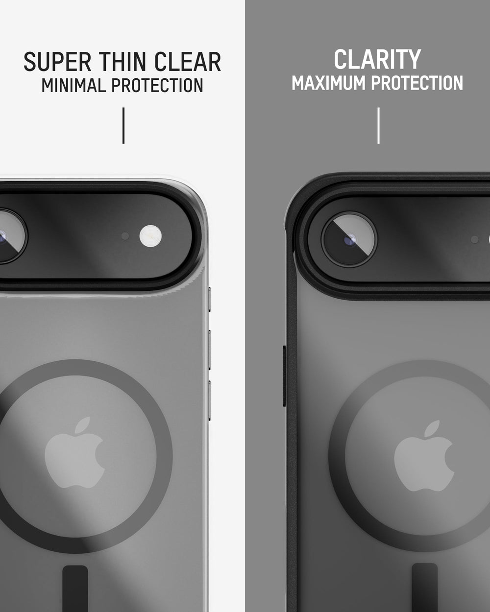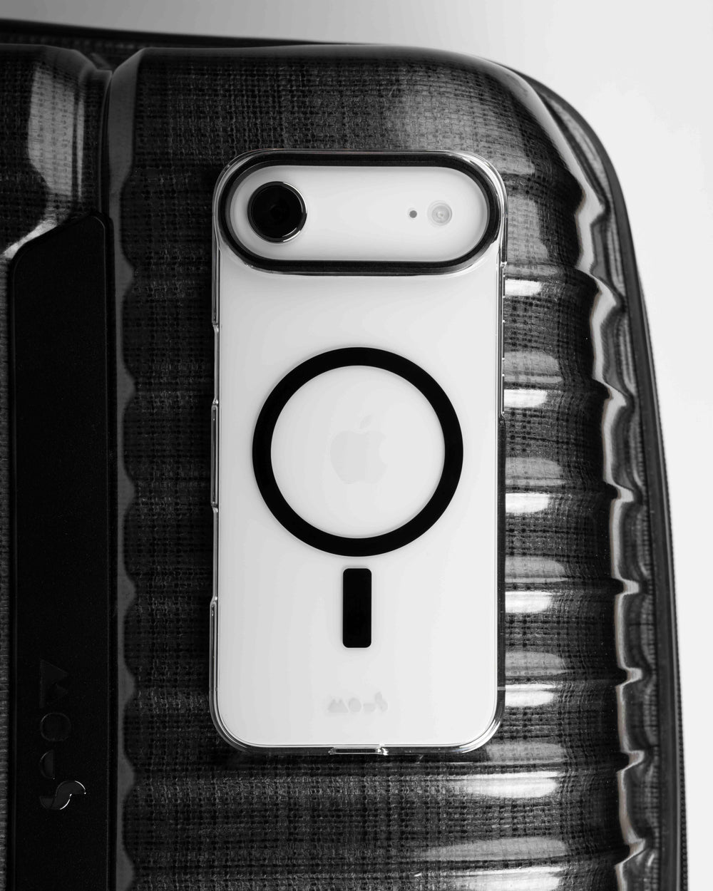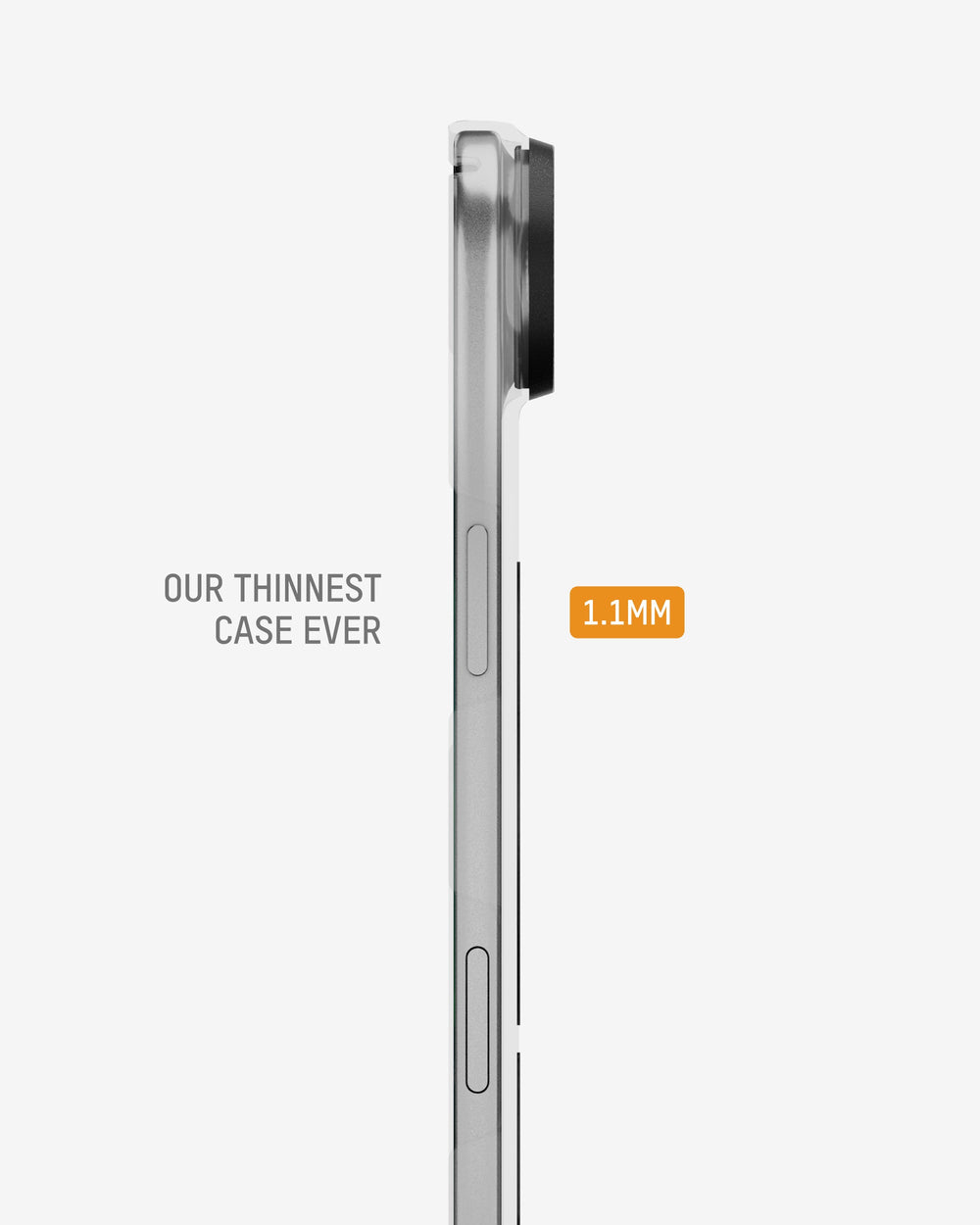 Our thinnest clear case, made from crystal‑clear polycarbonate with UV- and scratch‑resistant coatings. Includes cut‑outs for button access and full MagSafe®/Qi2 compatibility.