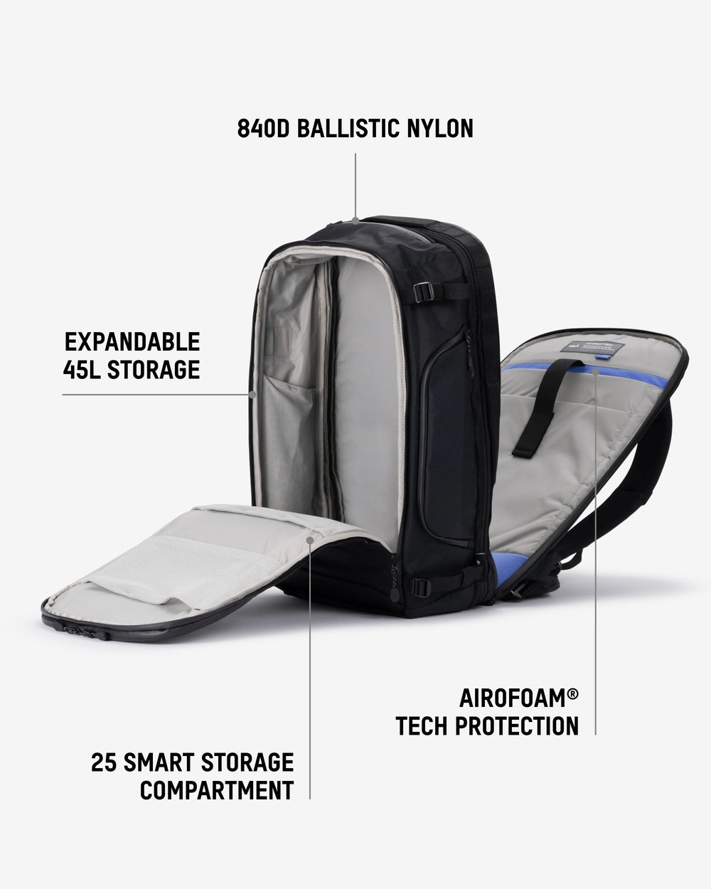 • 40L capacity expands to 45L for longer trips and max packing flexibility. Compliant with major airlines.