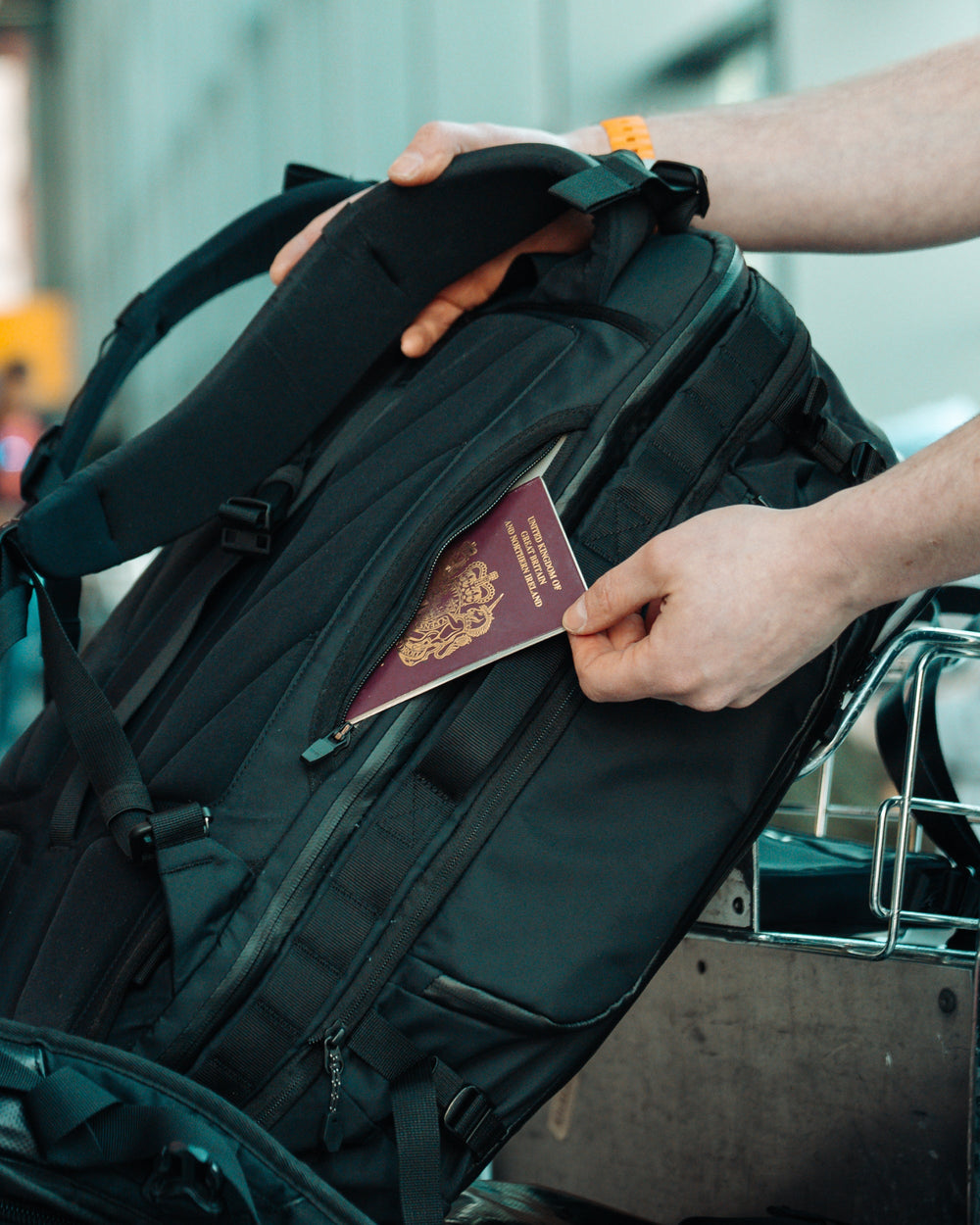 • Luggage pass-through strap slots over suitcase handles for smooth airport navigation.