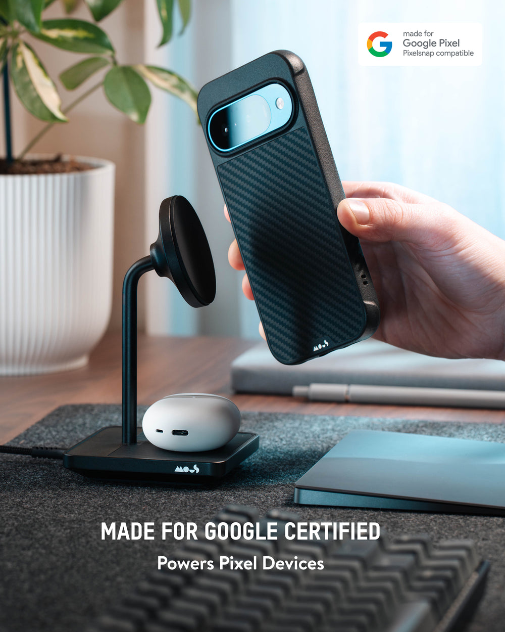 This stand is Made for Google certified, meaning it meets Google's standards for safety, quality and performance with Pixel devices. However, it’s also fully universal – working seamlessly with Qi2-enabled devices like iPhone as well as Android devices and older Pixels in Mous MagSafe® compatible cases for reliable snap-on charging.
