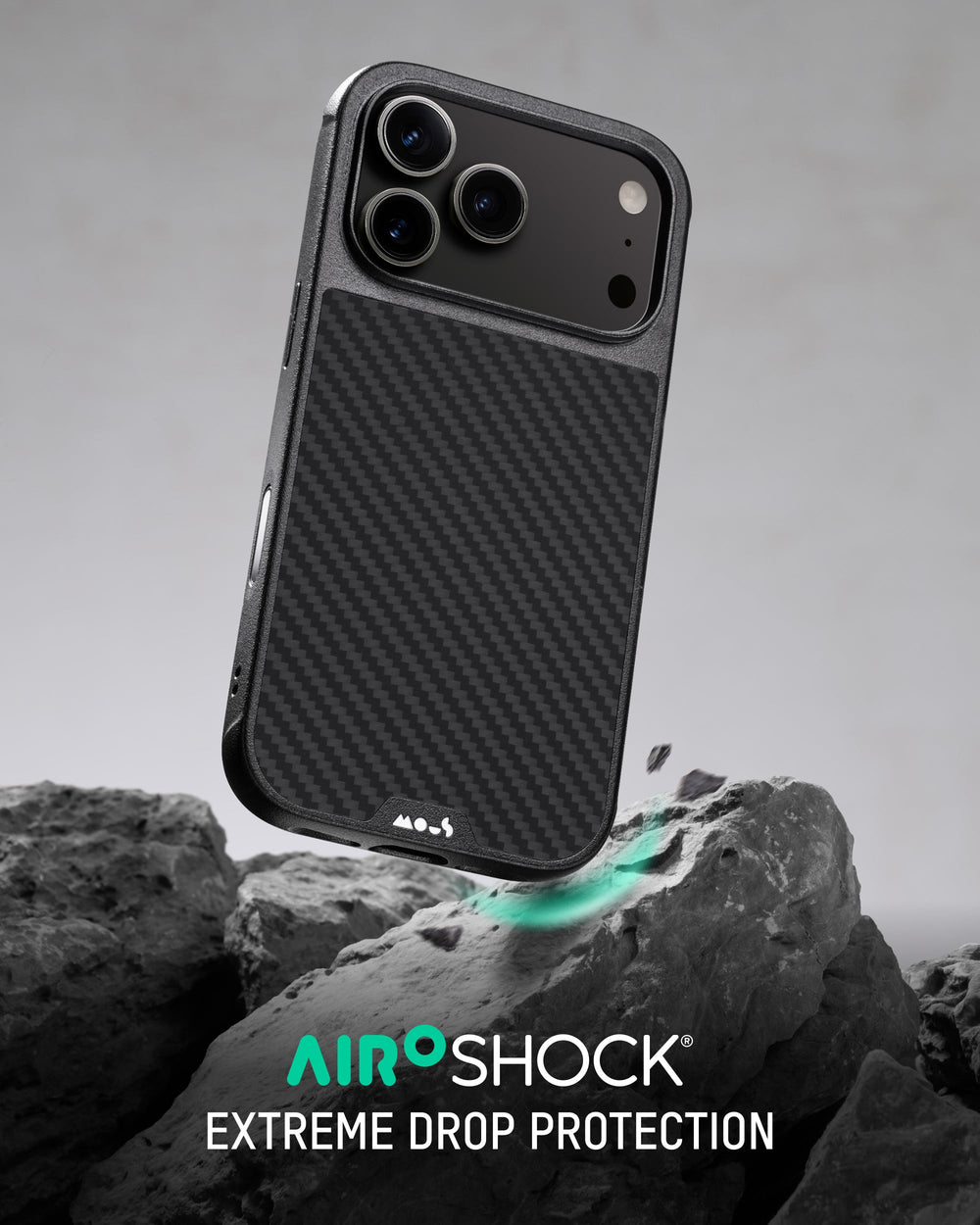 A high-impact material, engineered to absorb and disperse energy during drops and shocks. Designed to slow the rate of deceleration upon impact, AiroShock® cushions your device by reducing the force it experiences when it hits the ground.