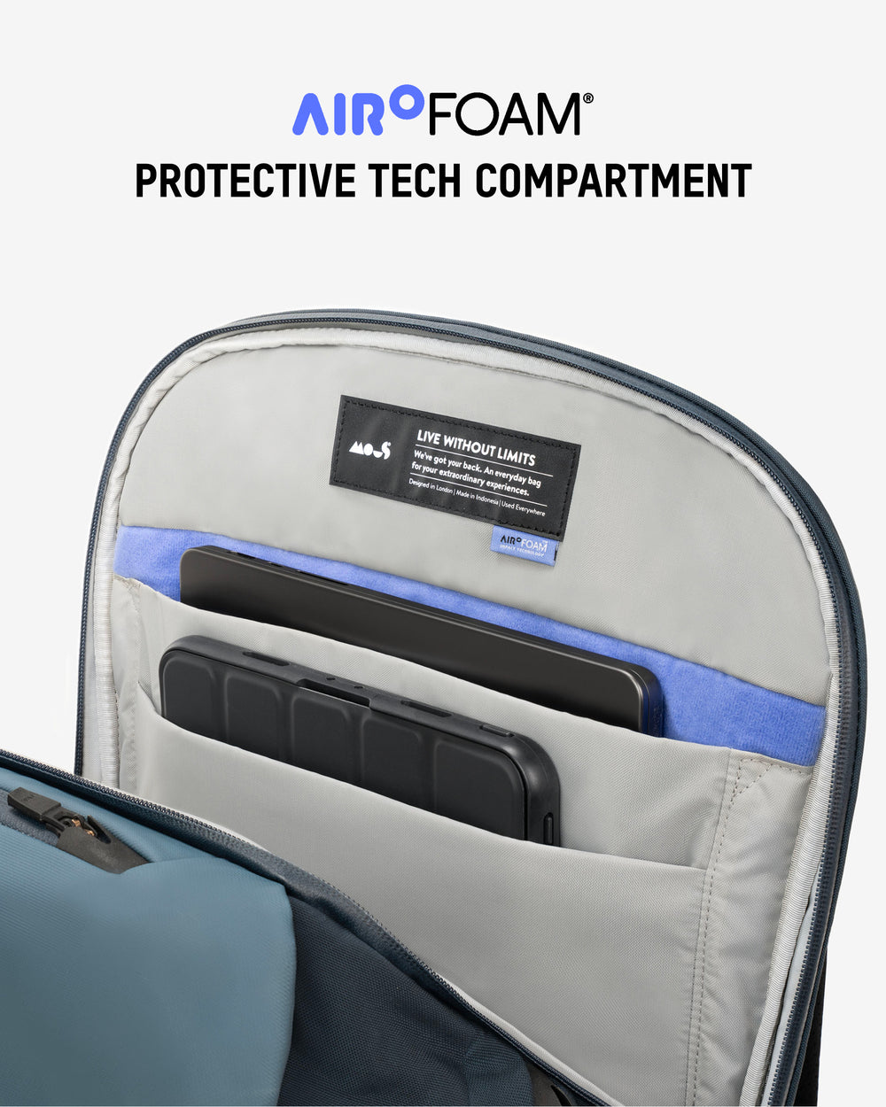 • Protective tech compartment with AiroFoam® absorbs shock from drops.