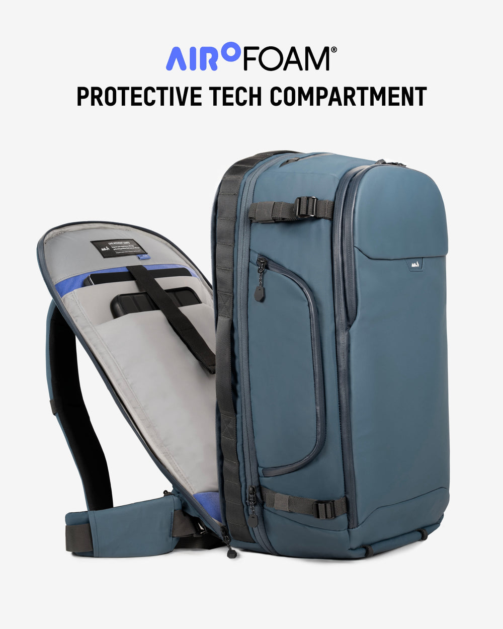 Impact-absorbing AiroFoam® lines the tech compartment to shield laptops and tablets from drops and shocks.