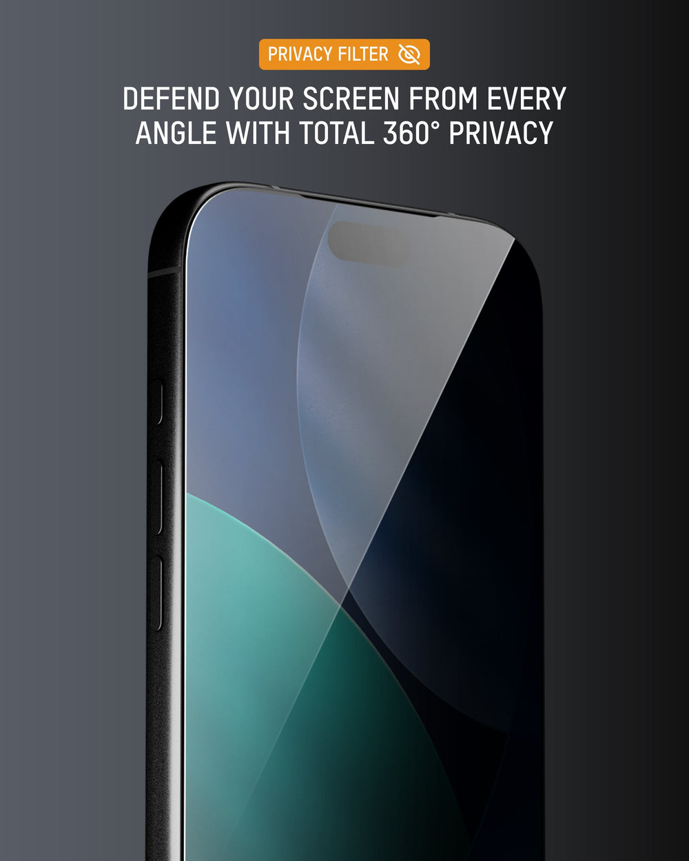 Privacy screen protector with 360° two-way filter, high-level scratch resistance and edge-to-edge coverage. Keeps your display clear to you but hidden from prying eyes.
