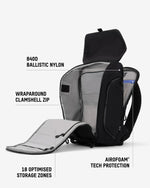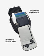 • 18 purpose-built pockets, including stretch mesh, quick-access, hidden AirTag and water bottle holder.