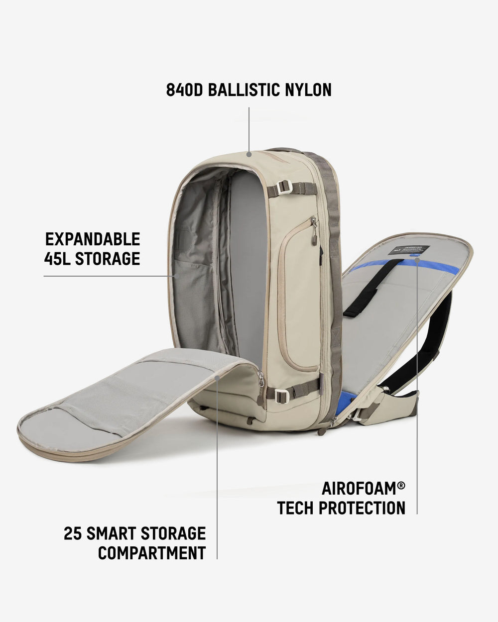 A carry-on backpack designed for seamless travel. With expandable storage, smart organisation, AiroFoam® tech protection and durable materials, it’s built for every journey.