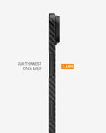 Our thinnest case, moulded from aramid fibre for everyday durability with a seriously slim profile, strategic cut‑outs for unhindered button access and full MagSafe®/Qi2 compatibility.
