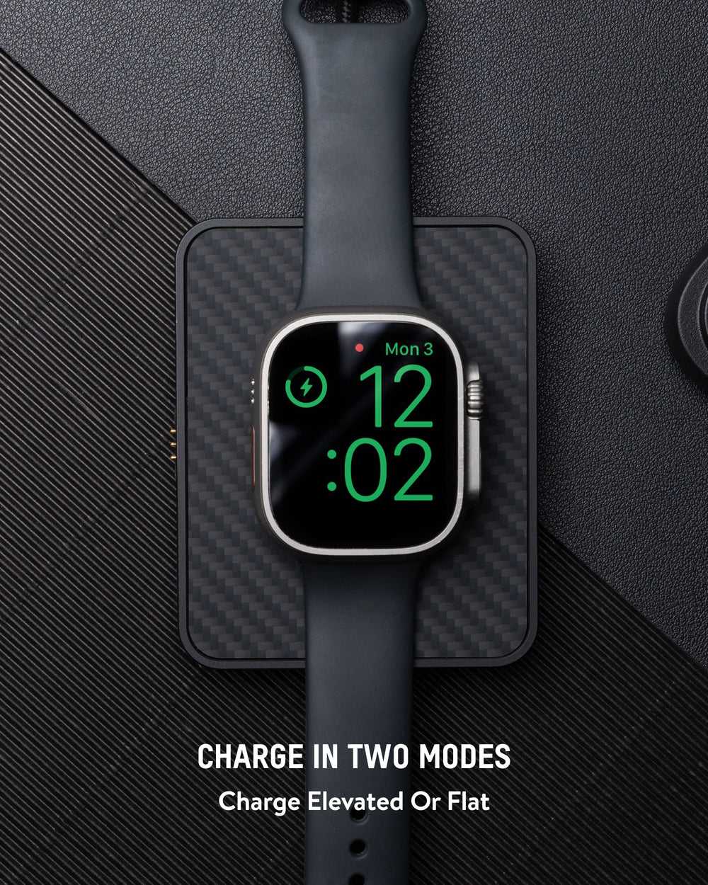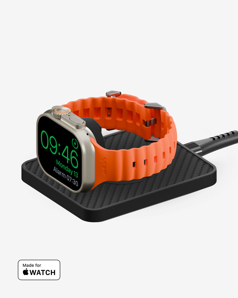 • Charge in two modes: flat or elevated. Enable Nightstand Mode on Apple Watch to turn it into a bedside clock when charging in the elevated position.